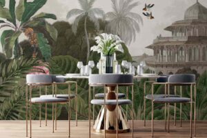 Who doesn’t like to feel like royalty while dining? If you want to recreate that feeling of luxury in your dining space- you can opt for some exotic themed wallpapers. Recreate a Turkish motif in brilliant blues and Byzantine patterns, or go for some gorgeous Arabesque themes. You can also go for Oriental motifs like cherry blossoms or Chinoiserie mountains.