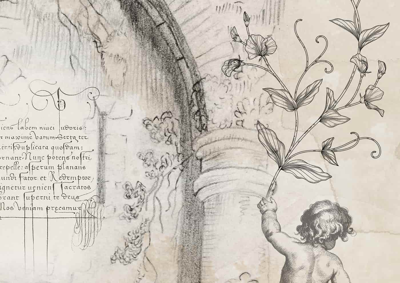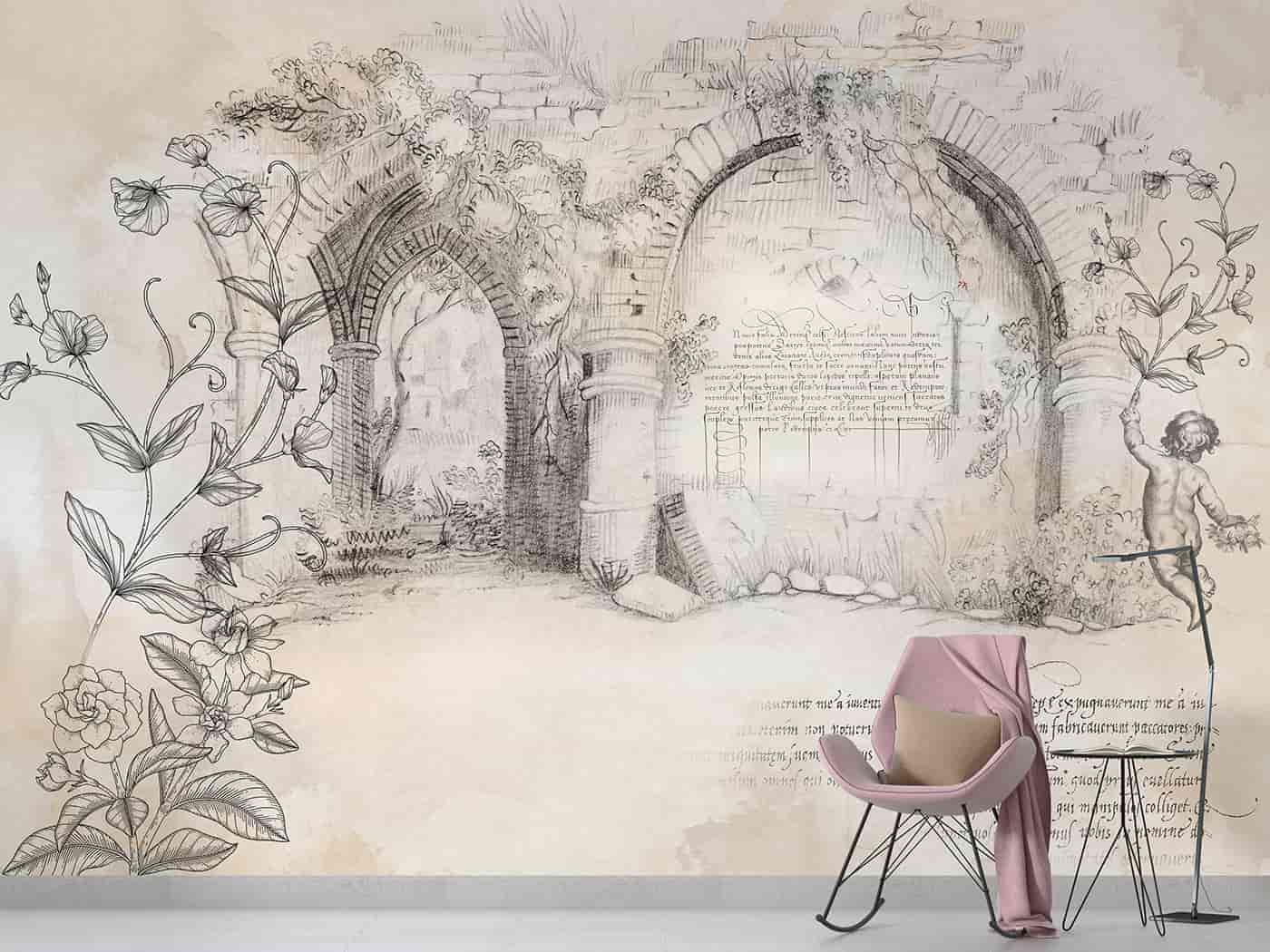 French Country Style Wallpaper- Hand-Drawn Garden Wall Mural with Floral Details