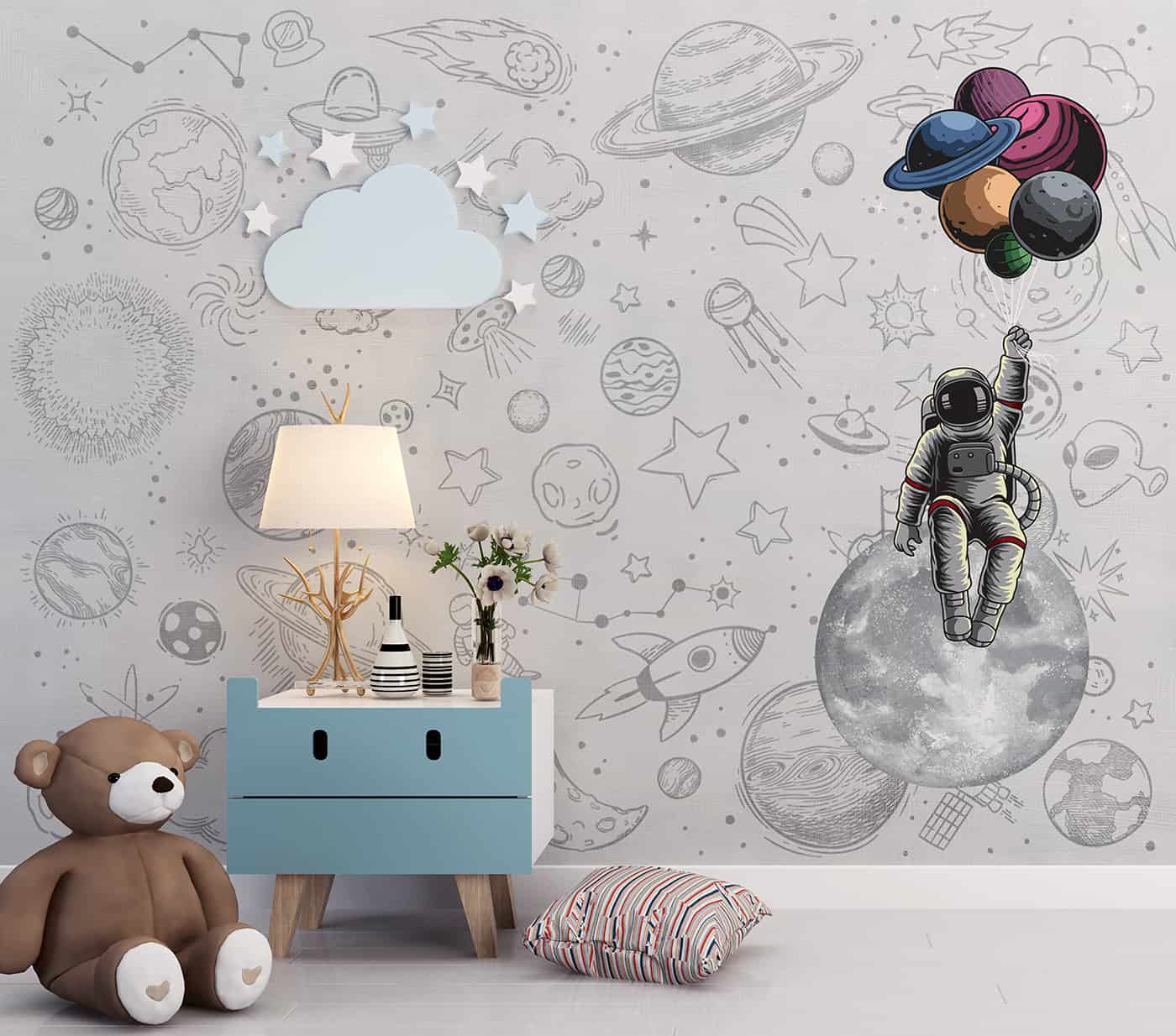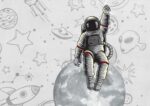Cute doodle astronauts, planets, rockets and stars in space