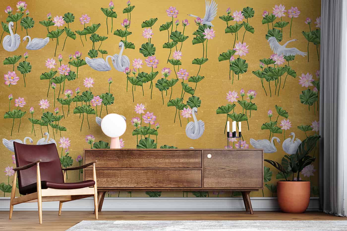 Golden Swans in lotus pond Wallpaper Mural