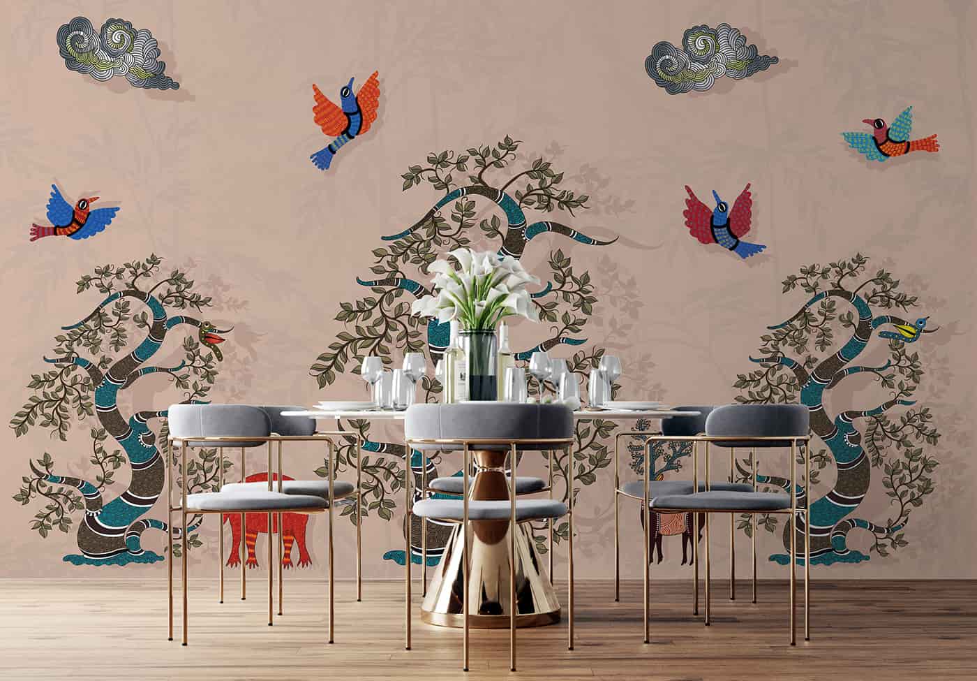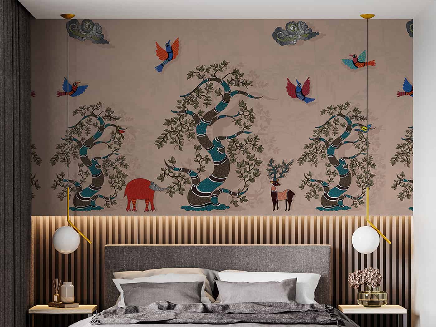 Indian Tribal Gond Style Wall Mural | Tree of Life with Elephants & Peacocks Wallpaper