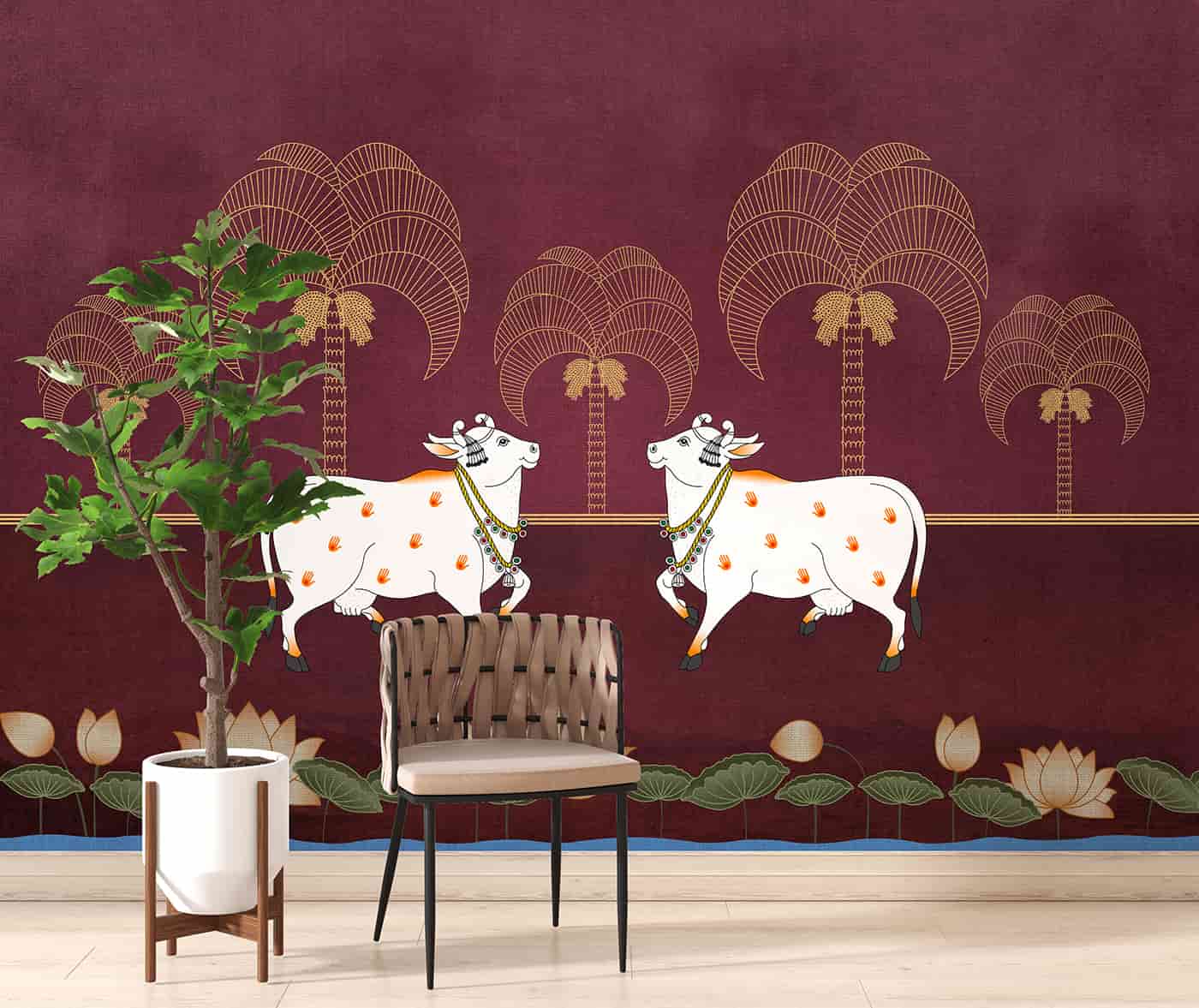 Modern Pichwai Cows n Lotus Wallpaper Mural