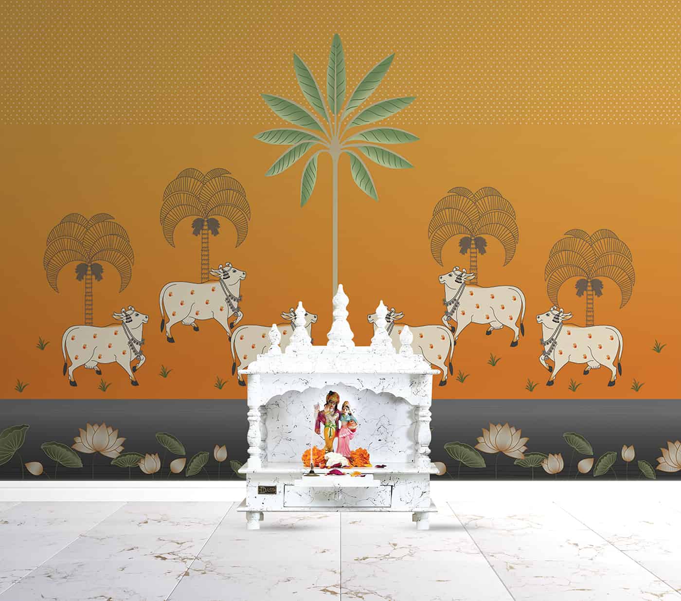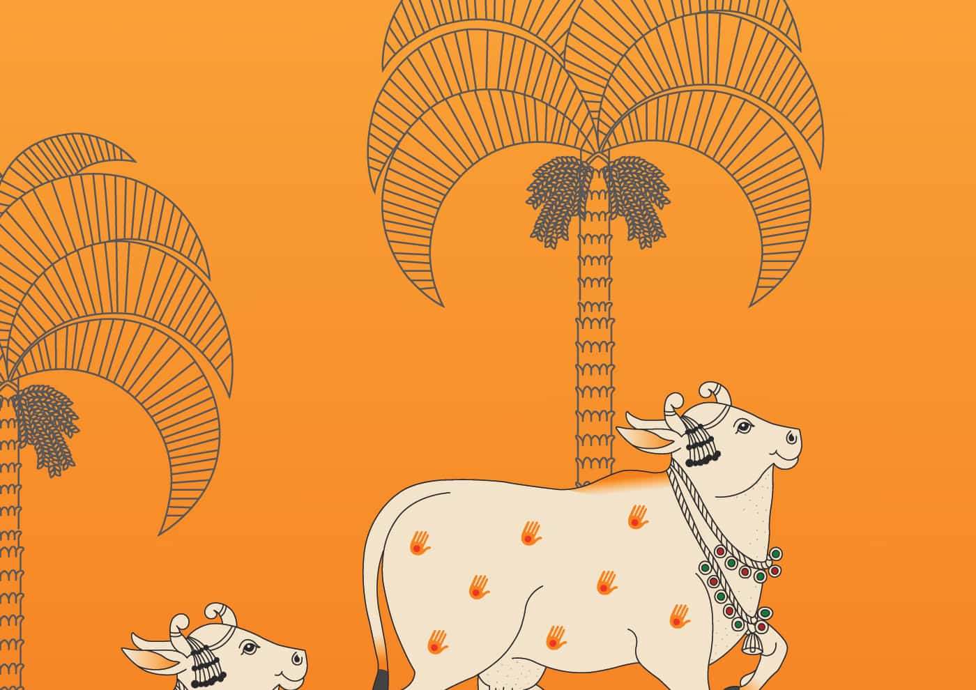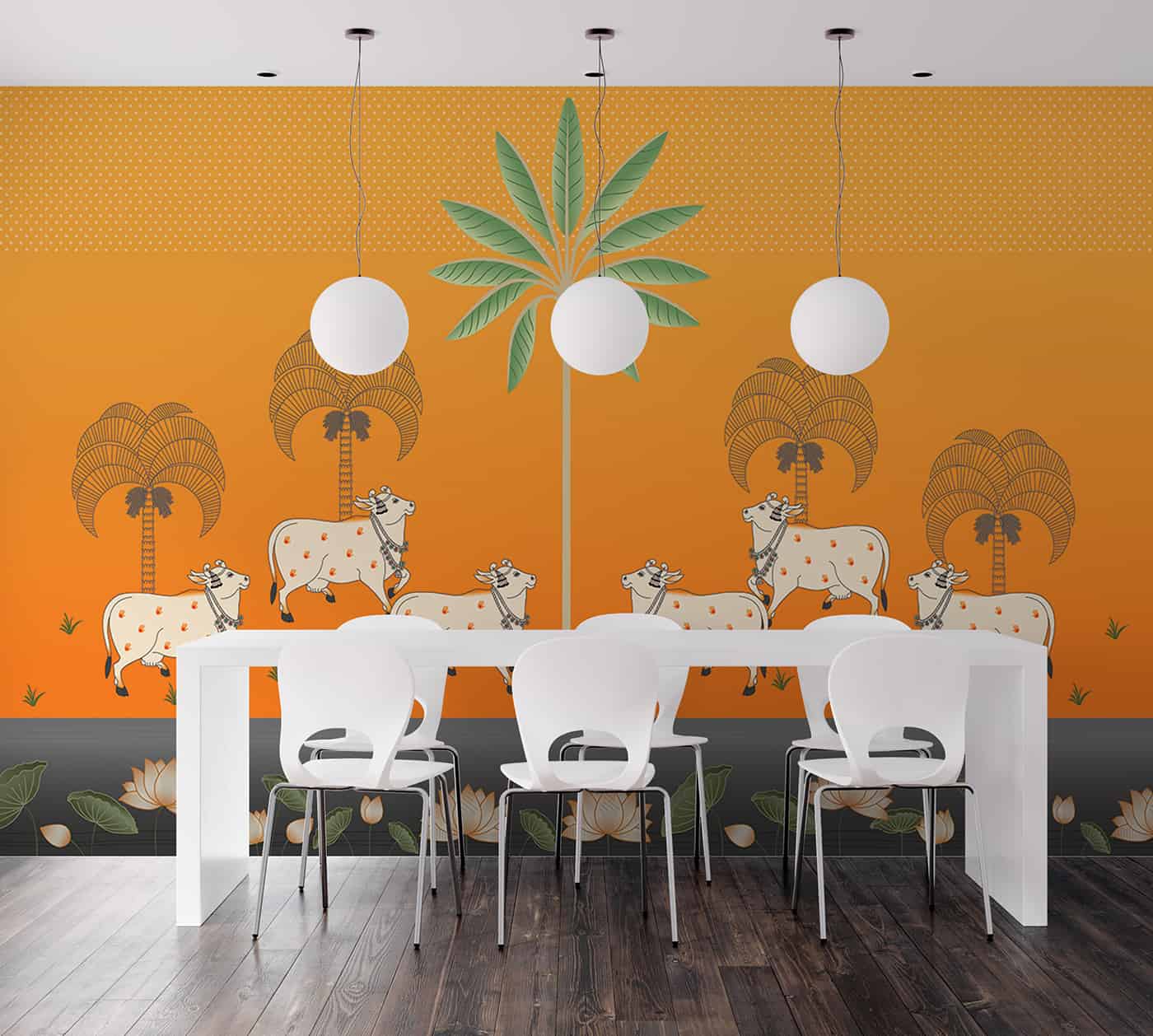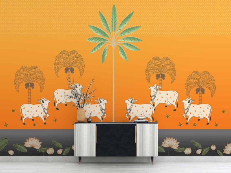 Pichwai-Cows and Lotus in orange background