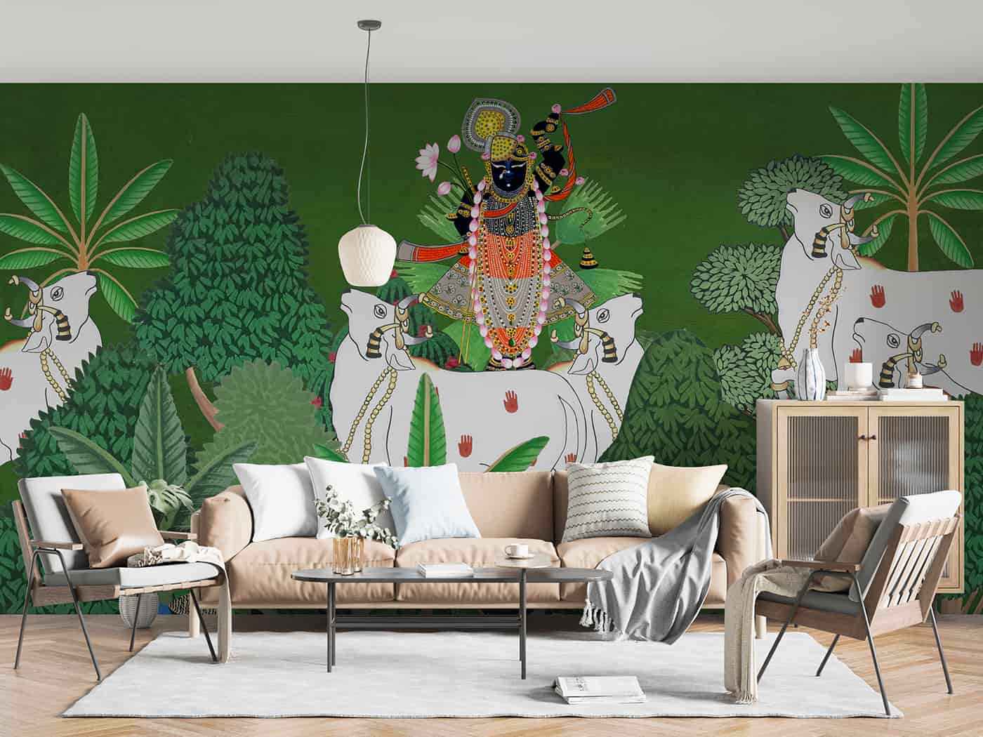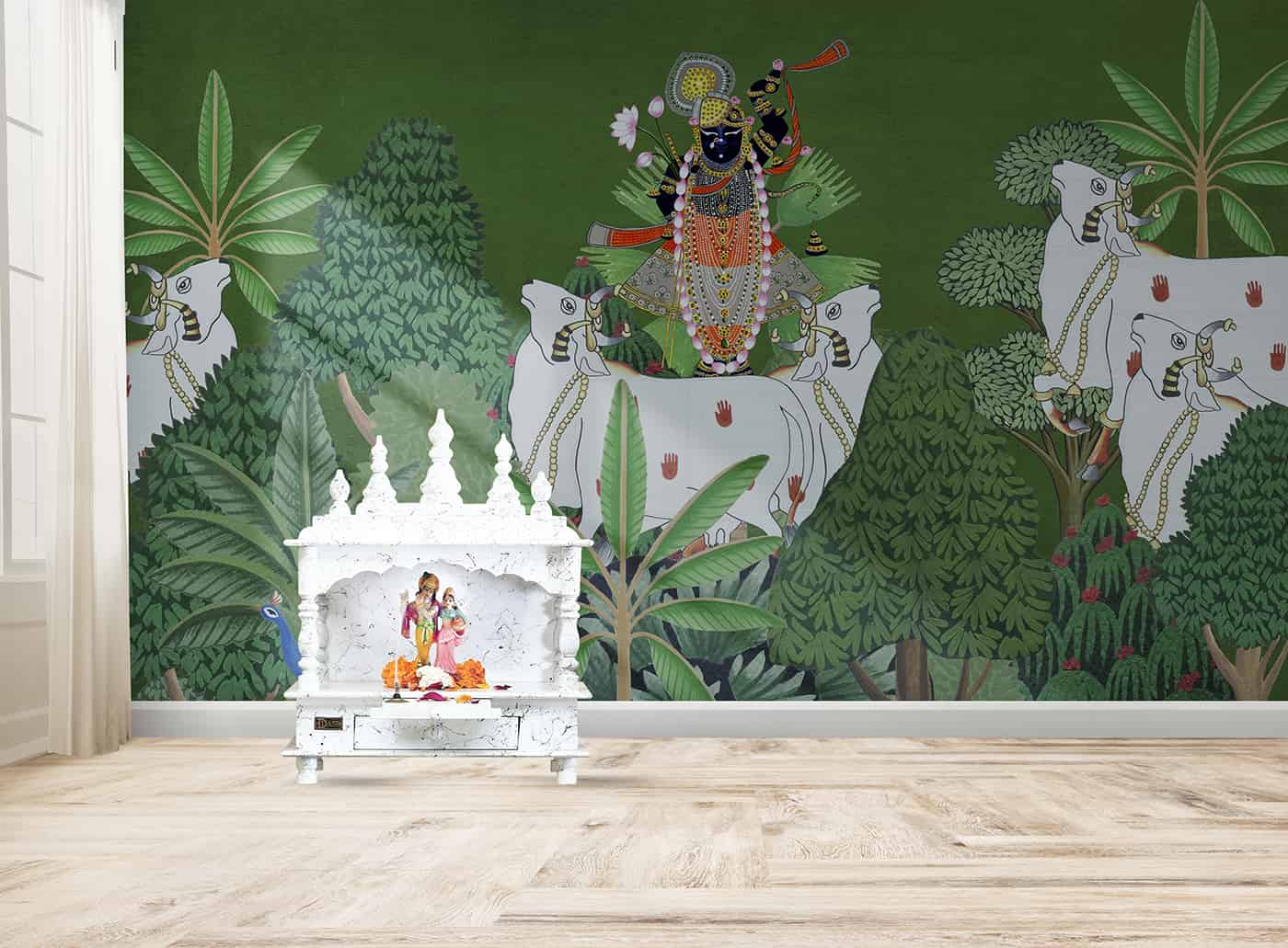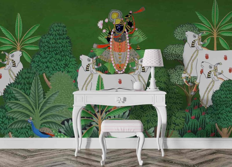 Shrinathji surrounded with Cows and Trees